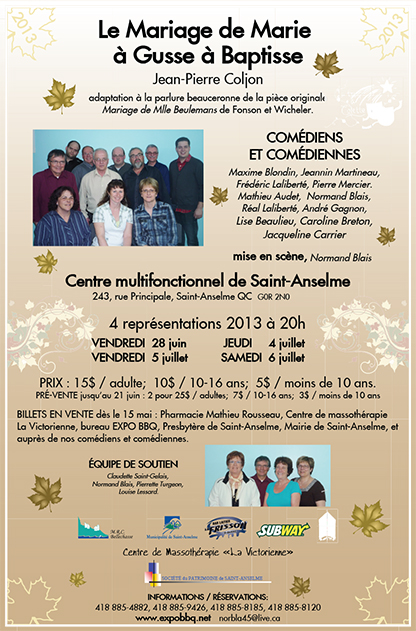 Sixième production (quatre représentations) : le vendredi 28 juin 2013, ainsi que les 4, 5 et 6 juillet 2013 à 20h au Centre multifonctionnel de Saint-Anselme (Comté de Bellechasse - au sud de Lévis-Québec) situé au 243, rue Principale, par la Troupe à Colette du Patrimoine de Saint-Anselme |